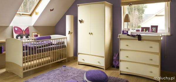 W skład kolekcji wchodzą następujące bryły: łóżeczko, szafa, komoda, przewijak do komody oraz półka wisząca.