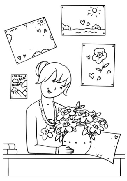 Kolorowanka Nauczycielka z kwiatami do wydrukowania