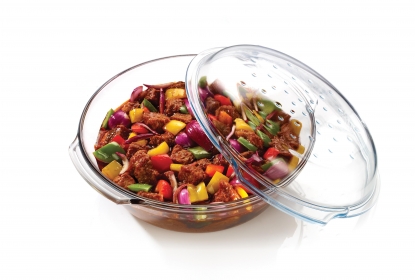 Naczynia żaroodporne Grill&Drop 4,6 l to produkt innowacyjny. Jest odpowiedzią na rosnącą liczbę konsumentów, pragnących prowadzić zdrowy i ekologiczny styl życia. Zastosowany w produkcie nowoczesny system Grill&Drop wymusza obieg pary wodnej i aromatu, co sprawia że potrawy są soczyste, aromatyczne i smaczne, a gotowanie staje się dużo prostsze i przyjemniejsze. Dodatkowo szklane ryfle na dnie pojemnika, zapobiegają przywieraniu potraw, a szklane krople w pokrywie naczynia zapewniają równomierne nawilżenie potrawy.